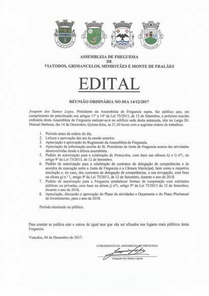 Assembleia de Freguesia, a realizar no dia 14 de dezembro pelas 21:30h no edifício da sede de junta, em Viatodos.