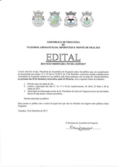 Assembleia de Freguesia, a realizar no dia 26 de setembro pelas 21:30h no edifício da sede de junta em Viatodos.